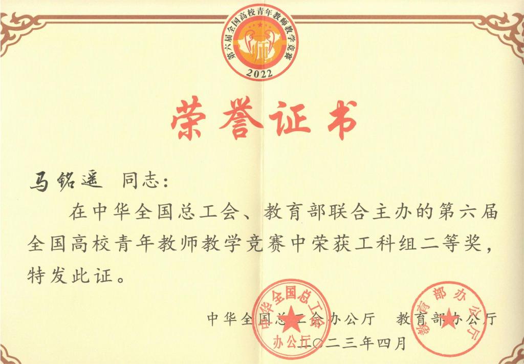 4月20日至24日,中华全国总工会、教育部主办的第六届全国高校青年教师教学竞赛决赛在清华大学举行,m88官网马铭遥老师经过激烈角逐,获得全国青教赛二等奖,工科组第六名。