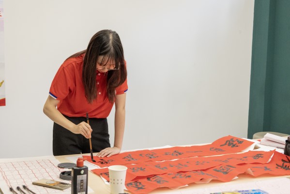 活动最后,2019级本科生伍钰婷同学笔力遒劲书写下“电气公司师生祝福伟大祖国繁荣昌盛,祝福公司弦歌一路高声唱,一片其乐融融的氛围中,现场师生也纷纷拿起纸笔,书写对祖国、母校的热爱与祝福。