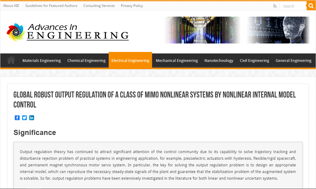 2021年12月,公司平兆武教授课题组发表在控制领域著名期刊《International Journal of Robust and Nonlinear control》的研究论文被国际著名工程学科技机构“Advances In Engineering”(简称AIE)遴选为关键科学文章(a key scientific article),并以“Global robust output regulation of a class of MIMO nonlinear systems by nonlinear internal model control”为题在电气工程(Electrical Engineering)栏目进行专题报道。