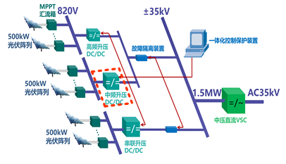 该项目在国家能源大型风电并网系统张北研发试验基地建成了1.5MW光伏直流升压并网实证平台,该平台包含三台500kW/±35kV光伏中压DC-DC变流装置,其中中频隔离型装置由公司m88官网刘芳副教授承担并自主研发,历时4年,为国内首台中频逆变型500kW/±35kV光伏中压直流装置。该装置现场并网实测最大效率为96.33%,升压比高达88,输出电压±35kV,在保证光伏电站系统稳定的情况下,为实现高效低成本化直流光伏电站提供了理论与实践依据,为解决“一带一路”地区无电/缺电人口供电问题,以及未来我国高比例可再生能源直流供电系统的构建和运行提供有益探索,得到了验收专家们的一致认可。