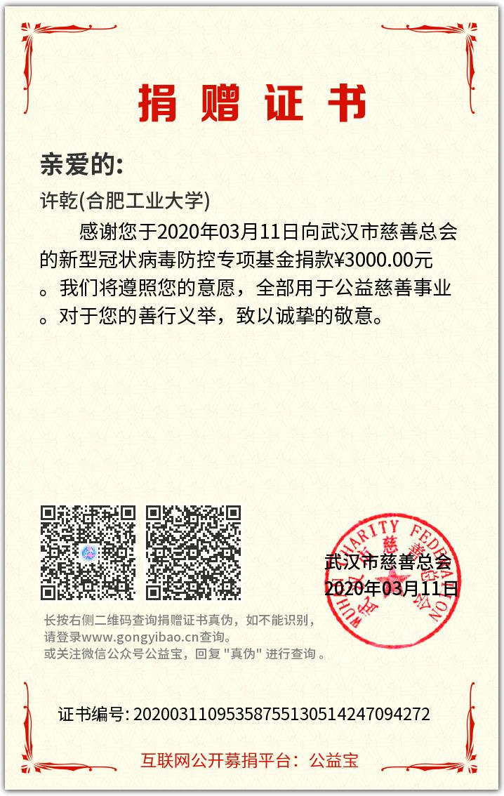 近日,电气与工程公司电气工程及其自动化专业17级本科生许乾同学,将自己大二学年获得的3000元社会捐资奖学金全额捐赠给了武汉市慈善总会,用于支持新冠肺炎疫情防控。