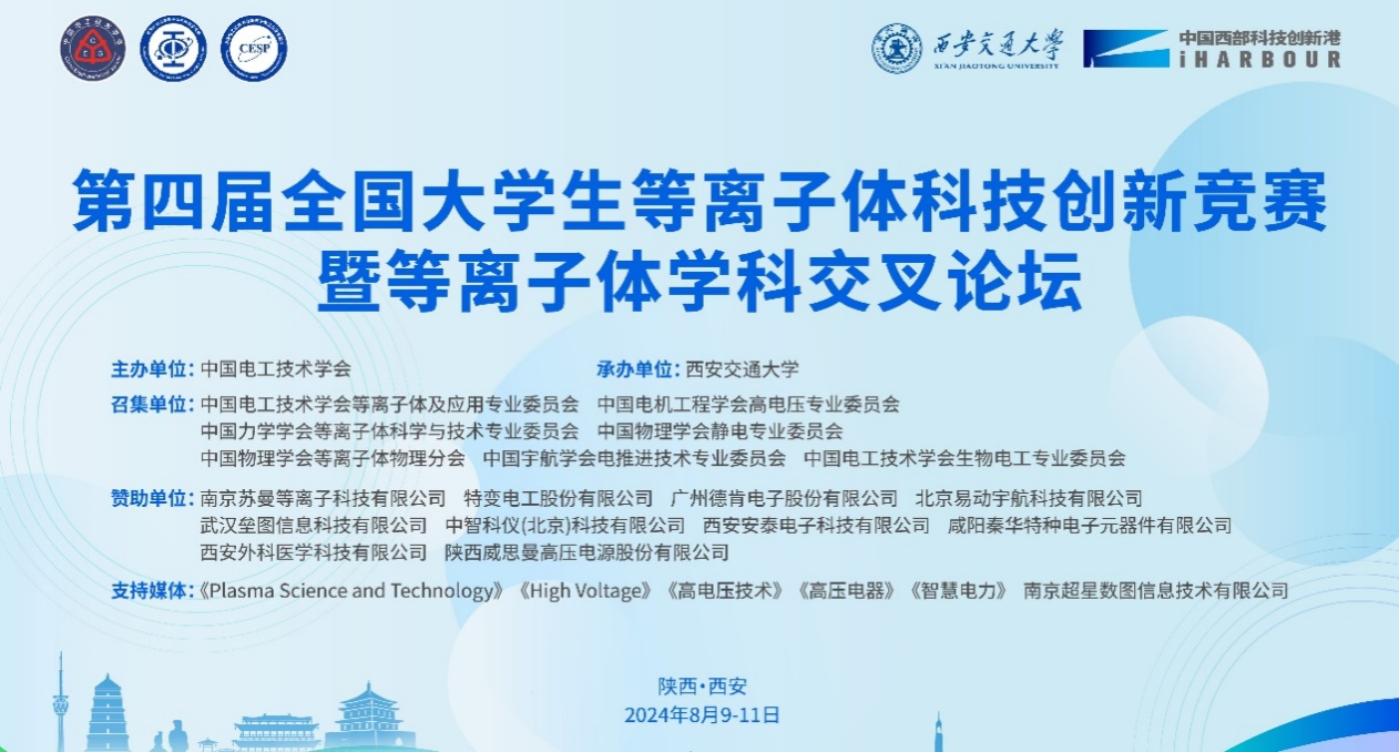 2024年8月9日-11日,第四届全国老员工等离子体科技创新竞赛决赛在陕西省西安市中国西部创新港顺利举行。本届竞赛由中国电工技术学会主办,西安交通大学承办,召集单位包括中国电工技术学会等离子体及应用专委会、中国电机工程学会高电压专委会、中国力学学会等离子体科学与技术专委会、中国物理学会静电专委会、中国物理学会等离子体物理分会、中国宇航学会电推进技术专委会、中国电工技术学会生物电工专委会。