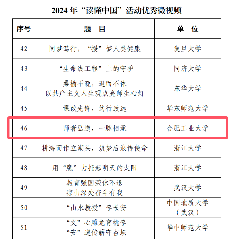 11月29日,教育部关工委公布2024年“读懂中国”活动入选作品名单,公司作品“师者弘道,一脉相承”获优秀微视频奖项。