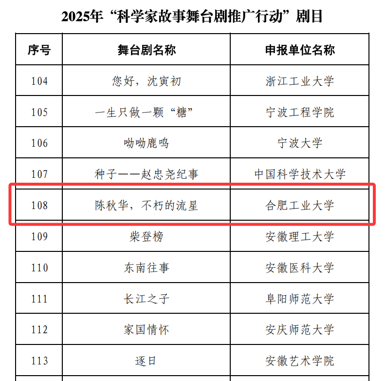 7月9日,中国科协发布了2025年“科学家故事舞台剧推广行动”剧目的通知,公示了“科学家故事舞台剧推广行动”剧目名单,公司作品《陈秋华,不朽的流星》成功入选立项。