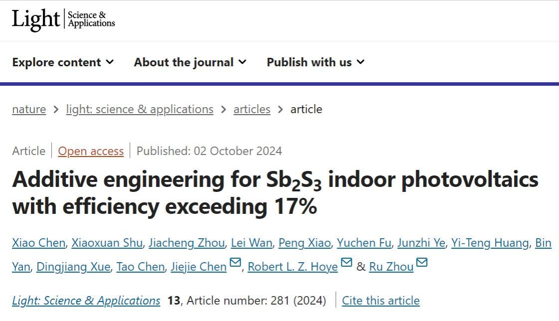 近日,公司m88官网周儒课题组在先进室内光伏技术领域取得最新进展,相关研究成果以“Additive engineering for Sb2S3indoor photovoltaics with efficiency exceeding 17%”为题在线发表于Nature合作期刊《Light: Science & Applications》,该刊为光学领域国际顶级学术期刊。