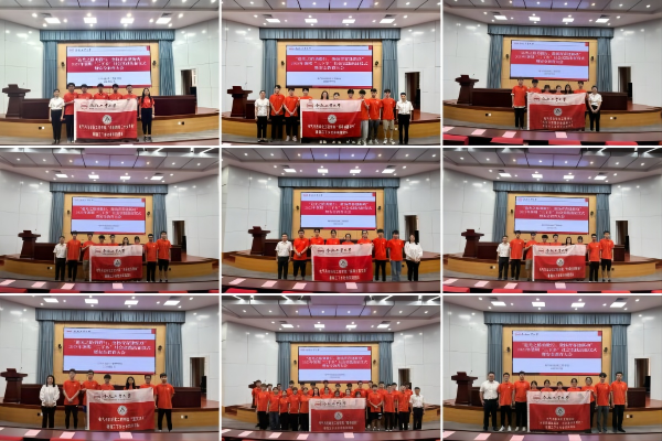 实践团员工代表吕双杰宣读《2023年暑期“三下乡”社会实践活动安全承诺书》,全体成员将安全意识深深烙刻进坚毅的笔迹里。与会老师为立项团队授旗,各团队成员将青年担当镌刻在光影的誓言里。