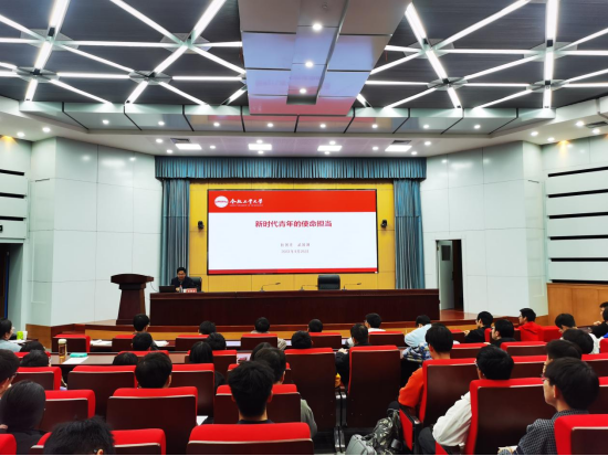 4月26日晚,m88官网“勇担时代重任,彰显青年担当”主题党课在学术会议中心一楼大报告厅顺利举行,m88官方网站登录地址团委书记武国剑为全体学员上专题党课,分党校第69期老员工入党积极分子班全体学员参加学习。