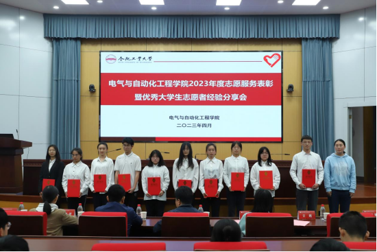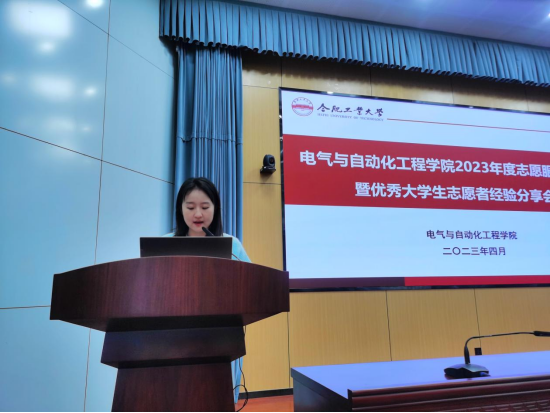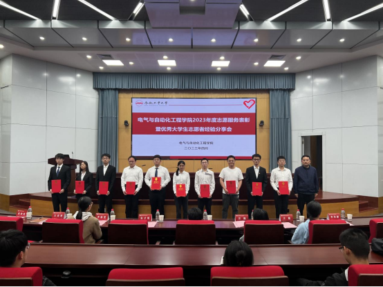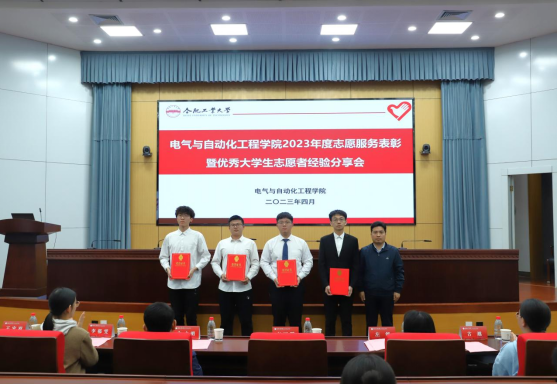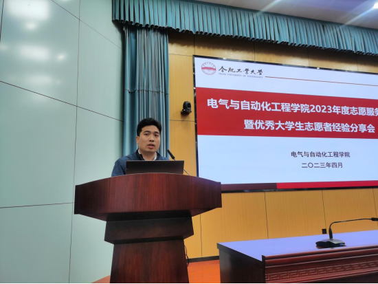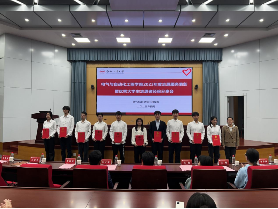 分享交流环节,十佳老员工志愿者代表分主题开展志愿服务经验分享,李子昊以《爱出者爱反,福往者福来》为题介绍自己的志愿服务和心得感悟,重点向同学们分享了无偿献血的先进事迹,激励青年学子在服务奉献中实现自身价值。信冉通过初相识、向阳生、系老情、展蓝图四个部分介绍自己从坚守初心到茁壮成长再到使命传承的志愿经历。张帆重点介绍了自己在儿童帮扶、校园宣传、志愿服务等方面的事迹,从个人素养提升、培养社会责任感等方面介绍了志愿服务的价值意义。丁浩航从社区治理、文明实践等方面展示了自己的志愿服务经历,鼓励同学们投身志愿服务,贡献青春力量。电气20-6班王子康、电气20-5班王翔宇代表志愿服务先进班级做经验分享,介绍了班级开展志愿服务的整体情况、特色活动和突出典型,介绍了“党建引领团建,团建带动班建”总体格局,党团员带头服务,营造了人人参与志愿,人人乐于服务的良好氛围。受表彰的先进班级和个人有的利用寒暑假奋战在疫情防控、抗洪救灾一线,有的投身敬老助老服务,助力社区文明建设,有的热心教育事业,关爱困境儿童,陪伴成长成才,有的积极宣传环保理念,以实际行动守护美好家园,志愿者的优秀事迹感动了现场每一名观众,热烈的掌声在会场此起彼伏。