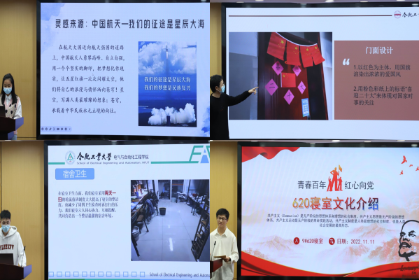 本次大赛共有180余间寝室参加,12间寝室入围决赛。从新青年海报到亮红色党旗,从中国精神的诠释到逐梦航天的理想,有的宿舍用红旗渲染浓浓爱国风,表达对祖国的热爱,宣告青春的誓言。艺术装点生活,生活品味艺术,有的宿舍以音乐治愈、用音乐温暖,在歌声中传递积极向上的态度,表现轻快明媚的艺术风趣。学思践悟,席典枕文,有的宿舍让简约融入生活,让学习成为共同追求。青春洋溢着活力的气息,有的宿舍用运动海报和体育器材书写运动乐章,在运动垫上鸣奏青春旋律。院员工办公室主任兼团委书记闫志伟点评总结,希望同学们“共融”生活习惯、价值观念和家庭背景不同造成的认知差异,“共创”美好环境、美丽回忆和美善文化,“共享”成长经验、进步故事和成长点滴,鼓励同学们通过寝室文化的渲染点亮内心世界,成就更好的自己。经评审,最终七号南楼115获得一等奖,九号楼620等2间寝室舍获二等奖,二号北楼118室等3间寝室获三等奖,二号北楼119等6间寝室获优秀奖。