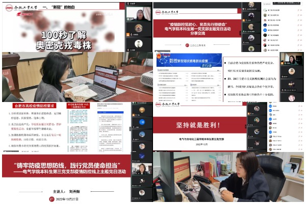 活动中,各支部指导老师通过对新冠知识及年度热词的普及,教育引导党员同志进一步认识到疫情防控形势的严峻性、复杂性;通过对合肥市相关防疫政策及疫情时报的分析,让大家认识到现阶段合肥疫情形势总体可控但仍不十分稳固;通过对公司疫情防控管制措施及警示案例的学习,进一步警示与会成员,应该严守公司防疫政策,发挥先锋模范作用。各党支部指导老师向全体员工发出倡议,作为党的先进分子应该做到“六个坚持”,一是坚持多通风、多打扫,遵守《寝室文明公约》,保持寝室卫生环境;二是坚持用心学、用劲学,按时参加线上教学,充分利用互联网搭建学习桥梁,自觉遵守教学规定;三是坚持不扎堆、不聚集,倡导出门佩戴口罩,杜绝外卖,减少网购;四是坚持每日检、每日报,恪守防疫规定,按要求测核酸、按规定健康打卡;五是坚持不信谣、不传谣,夯实信仰根基,增强网络道德意识;六是坚持多了解、多引导,提高国家抗疫时事关注度和疫情信息了解度,引导周边同学用知识武装自己,保护自我,用实际行动展现防疫战线上的青春之光。