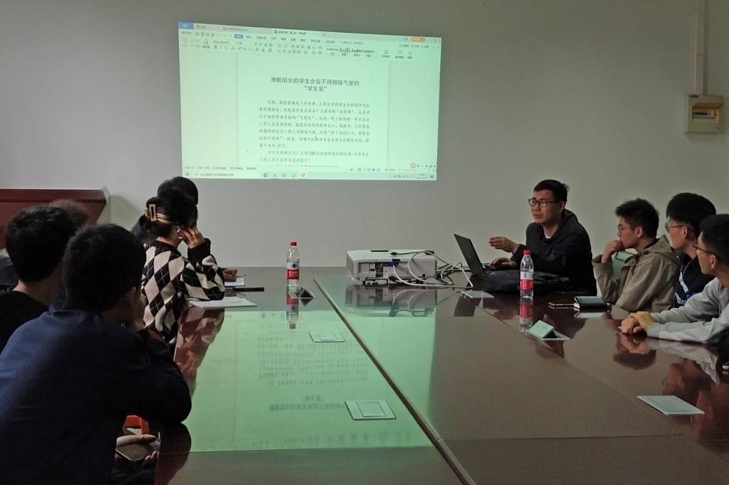会上,辅导员闫志伟就研究生会的思想、作风建设问题进行了主要发言,并与在场的研究生会负责人进行了深入讨论。辅导员闫志伟带领参会人员一起学习了习近平总书记关于青少年员工成长的重要论述摘编、共青团中央办公厅与全国学联下发的一系列相关学习文件,并结合公司实际情况对大家做出了相关要求和指导,把本应由管理机构承担的职责承担起来,把员工会从偏离服务同学宗旨和桥梁纽带定位的管理职能中解放出来,让员工会工作人员从“管理者”真正转变为服务同学成长的“同行者”。