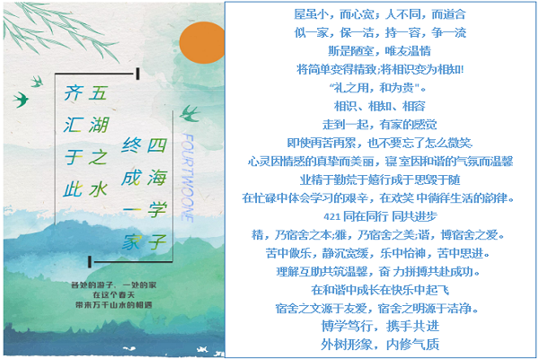 在评选出的优秀寝室中,二号南楼421寝室提出“屋虽小,而心宽;人不同,而道合;似一家,保一洁,持一容,争一流;斯是陋室,唯友温情”的寝风,展现温馨宿舍气氛。七号北楼305寝室以“戒满,戒骄,戒惰,戒浮”为寝训,以座右铭的形式提醒寝室成员共同维护良好的学习氛围。