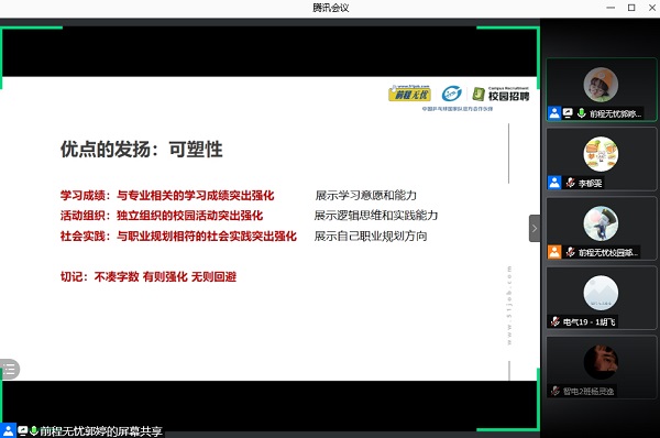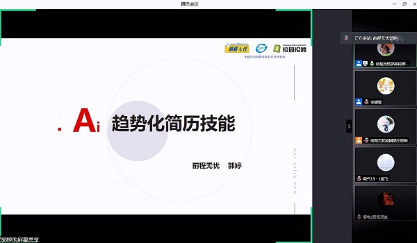 为提升员工的就业竞争力及简历制作能力,5月21日晚,m88官网举行“AI趋势化简历技能”线上讲座。活动邀请了前程无忧校园部经理王恒帅全程在线互动,前程无忧校园招聘部项目执行经理郭婷老师担任主讲,百余名同学参加在线培训。