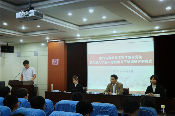 开班典礼由2020级辅导员、分党校班主任左能主持,会议开场后,全体起立并奏唱国歌;随后,党委副书记郑洁介绍了入党积极分子培训班的培训计划和相关要求,让学员们全面了解培训的内容、形式和重要纪律。接着,机器人工程19-1班肖幸飞同学代表全体入党积极分子,表达了争取早日加入党组织的决心和矢志不渝、努力奋斗的坚定信心。党委书记何岳颀在讲话中希望全体学员珍惜集中学习的机会,要求大家提高政治站位,增强“四个意识”、坚定“四个自信”、做到“两个维护”;加强理论修养,坚持读原著、学原文、悟原理;积极践行为人民服务的初心,从身边的小事做起,为公司文化建设、学风建设、班级建设服务,在实践中增长自身才干和能力。最后,开班仪式在庄严的国际歌中结束。