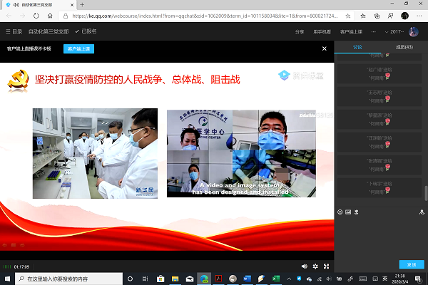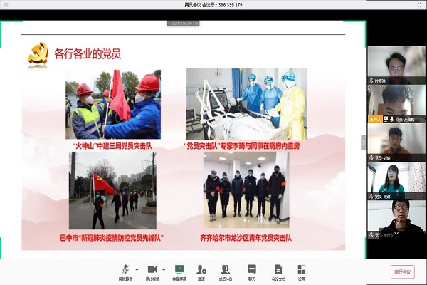 专题党课从防控政策宣贯、先进典型看齐、党员作用发挥等三个方面的主题展开。支部党员认真学习了习近平总书记关于防控新冠病毒疫情的重要指示和部署的相关精神,并在线上开展“疫情防控话榜样”专题大讨论,学习疫情防控工作中表现突出的优秀共产党员的先进事迹。通过学习和讨论,号召广大青年党员增强“四个意识”、坚定“四个自信”、做到“两个维护”,切实把思想、学习、行动统一到习近平总书记重要指示精神上来,认清肩负的责任使命,把打赢疫情防控阻击战作为当前的重大政治任务,以实际行动确保党中央重大决策部署贯彻落实,让党旗在防控疫情斗争第一线高高飘扬。