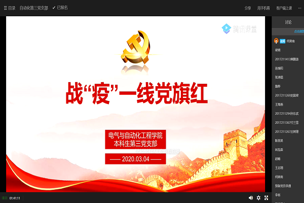 3月4日-5日,电气公司本科生党支部“云中党课”开讲。各支部书记分别以线上直播方式讲授《战‘疫’一线党旗红》《做‘疫’名先锋,守一份初心》和《抗击疫情守初心,防控一线践使命》专题党课。