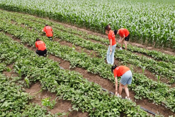 躬体力行务农事,实践农耕知劳苦。7月6日,团队踏入乡村基地的田野,开始了一场农耕劳动之旅。乡村振兴驻村工作队队长武艳芹首先向员工们介绍了当前城孜村农产品的种植情况,重点介绍了蜜薯、羊肚菌等特色农产品,随后指导同学们拿起农耕工具开始劳作。队员们纷纷表示在劳作过程中感受到了农耕的艰辛和乐趣,看着干净整齐的田地不再被杂草所缠绕,劳动的成就感油然而生。