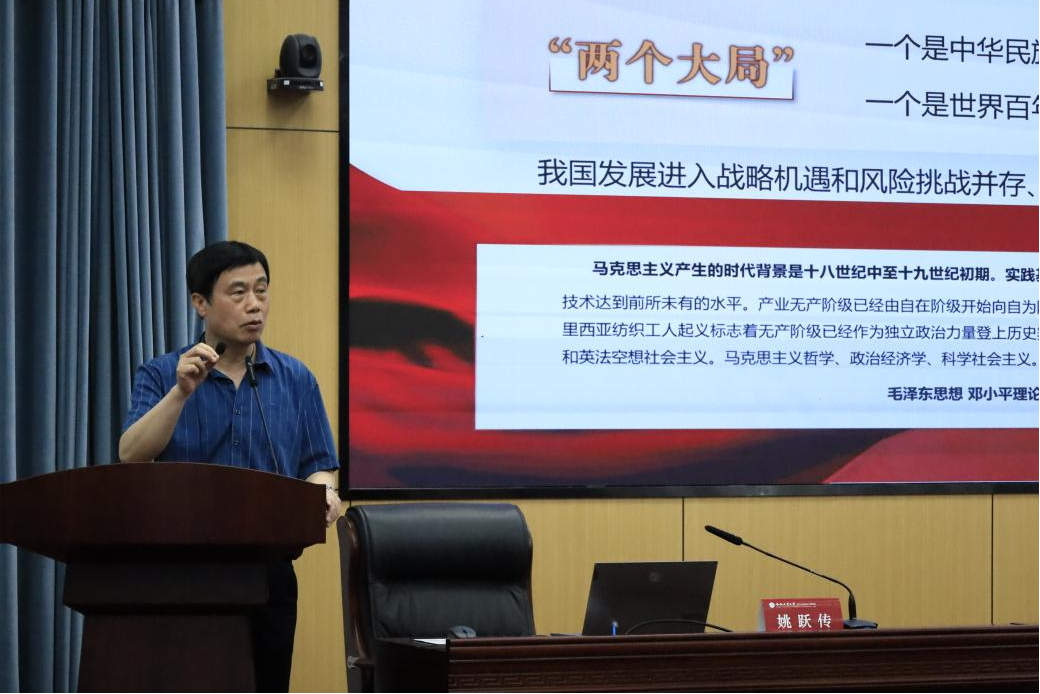 姚跃传以《青春向党担使命,启航筑梦新征程——深入学习贯彻习近平新时代中国特色社会主义思想》为题,深刻剖析了习近平新时代中国特色社会主义思想的创立背景、实践基础和历史地位。沿着历史脉络出发,从毛泽东思想到邓小平理论,到“三个代表”重要思想,到科学发展观,到习近平新时代中国特色社会主义思想,由浅入深,由表及里、层层递进、串古连今地简述了党的指导思想。由“两个大局”看国内国外,用“主要矛盾”阐社会发展系统地梳理了党的创新理论。引用习近平总书记对青年的殷切期望,鼓励学员继承和发扬五四精神,坚定不移听党话、跟党走,争做有理想、敢担当、能吃苦、肯奋斗的新时代好青年。