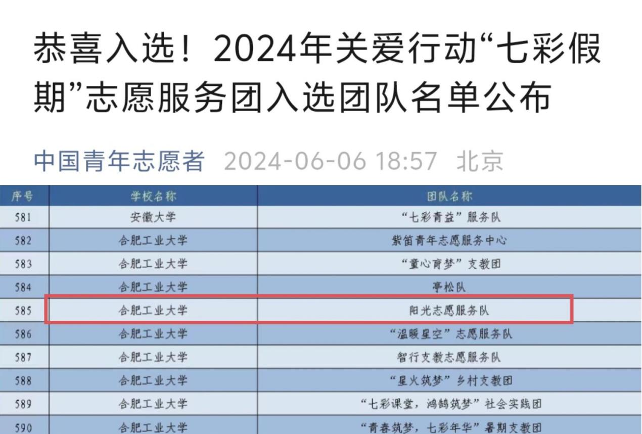 本次活动是为深入学习贯彻习近平新时代中国特色社会主义思想和党的二十大精神,切实加强对农村留守儿童、寄宿儿童、困境儿童等少年儿童群体的关心关爱,组织动员青年志愿者以实际行动投身中国式现代化建设,活动得到了各高校志愿服务团队的广泛关注和积极参与。主办单位对所有申报材料进行了认真审阅,最终来自全国1167所高校的2000支老员工志愿服务团队入选。公司高度重视儿童关爱志愿服务工作,打造‘熠’路童行、‘熠’伴成长等多个志愿服务品牌,多次组织志愿者利用寒暑假期深入社区、中小学、贫困山区公司开展儿童关爱志愿服务活动,涵盖科学小实验、文明风尚宣讲、多彩手工课堂、学业辅导、趣味运动会等多种形式,突出生命安全教育、节能环保宣传、防范校园欺凌等多个主题。聚焦困境儿童身心健康发展,为儿童成长提供暖心服务,营造关注儿童、关心儿童、关爱儿童的良好氛围。本次入选的“阳光志愿服务队”10名成员志愿经验丰富,积极参与儿童关爱志愿活动,表现优异,志愿服务时长累计1500余小时。团队多次利用寒暑假期和课余时间深入社区、中小学、乡村开展儿童关爱志愿服务活动,团队成员多次荣获校级奖励荣誉。