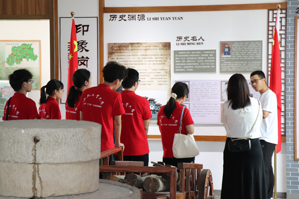 聚焦三农,三产融合兴旺乡。在马郢村情圆农场的丰收季节,南瓜大棚里洋溢着硕果累累的喜悦,农场负责人为团队成员揭秘南瓜生长的过程。这片采用立体式栽培的土地上,藤曼缠绕于高悬的长绳之上,既拥抱阳光,又亲吻微风。在农户的细心指导下,队员们分工明确,配合默契,形成一条高效的“流水线”。比质量、拼速度,劳动成果绘出一幅生机盎然的盛夏画卷。队员们俯下身子、迈开步子、撸起袖子,在农田中传承传统农耕文化,在汗水中树立“三农”工作新思维。在马郢创客基地的创意律动中,杨庙镇团委书记姚启坤以“民族要振兴,乡村必复兴”切入,倾情讲述了马郢村从昔日贫困的“三无村(无山无水无风景)”“空心村”逐步蝶变成充满创意、时尚鲜活的“旅游村”“网红村”,情至深处他激动的说:“正是无数青年志愿者的扎根坚守和默默奉献,让马郢村化‘腐朽’为‘神奇’,从萧条走向繁华,从空茫步入丰盈。马郢村将以马郢计划为蓝图,以生态的绚烂描绘出青年创业的沃土,以公益的多样性触动乡村的生命脉络”。随后,团队成员就本土青年人才服务乡村振兴的痛点难点,与马郢村乡旅合作社公益部部长孙涛进行了深入交流。身为乡村振兴的参与者、建设者与奉献者,孙涛认为,振兴乡村的关键在于如何吸引并留住青年人才,要以乡情为纽带,以深挖特色为路径,着力营造适宜青年创新创业的乡村生态硬环境,不断优化公共服务软环境,提升乡村的现代气息、田园气质和活力指数,才能吸引更多的优秀青年扎根乡村、安居乐业。