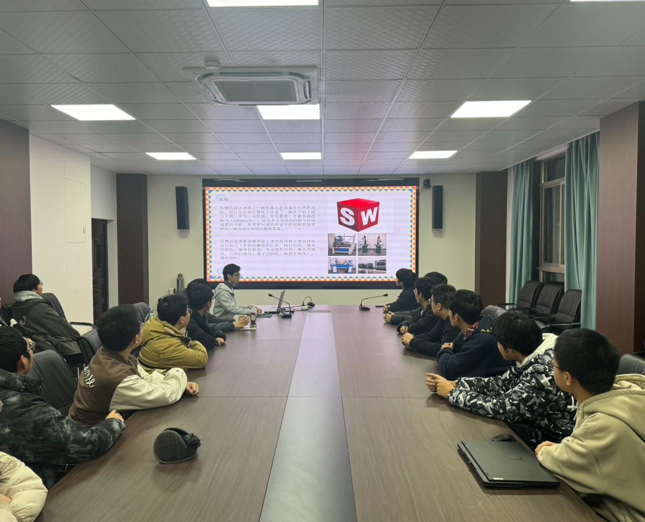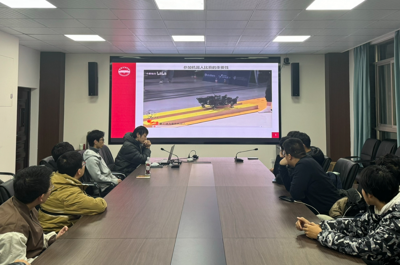 机器人工程专业2023级1班的郑卜俊宏同学,从机器人竞赛的起源、赛程安排、奖项类别等多个维度出发,详尽阐述了从选题策略、团队组建、信息搜集、方案设计到机器人原型开发与调试的完整链条。他不仅深入分享了备赛过程中遭遇技术瓶颈的破解策略、团队内部的高效沟通与协作机制,还谈到了面对挑战时的心理调适方法以及严格的时间规划与执行技巧。通过分享自己从机器人领域的初学者到熟练掌握各项技能的全过程,他进一步强调了扎实基本功对于机器人学习的重要性。他用自己的亲身经历告诉大家,无论是理论学习还是实践操作,都需要一步一个脚印,稳扎稳打,才能在机器人竞赛中脱颖而出,取得优异的成绩。机器人工程专业2023级2班、苍穹战队成员何兆卓同学结合近年来公司在RoboMaster高校系列赛中取得的成绩,为众人深入解读了这一赛事的内容。在交流中他谈到,参与这项高水平的机器人竞技赛事绝非仅凭一腔热血就能轻易驾驭。参赛者不仅需要拥有电子工程、计算机科学、机械设计等交叉学科的知识,更需在复杂多变的比赛环境中迅速定位问题并高效解决。更为重要的是,RoboMaster强调团队协作的力量,它要求每一位成员不仅要成为各自领域的“专家”,还要具备出色的团队合作精神,能够在紧张激烈的比赛中迅速响应、默契配合,共同克服难关。他勉励同学们跨领域学习,打破专业壁垒,拓宽学习视野,以促进团队内部的有效沟通与协作。