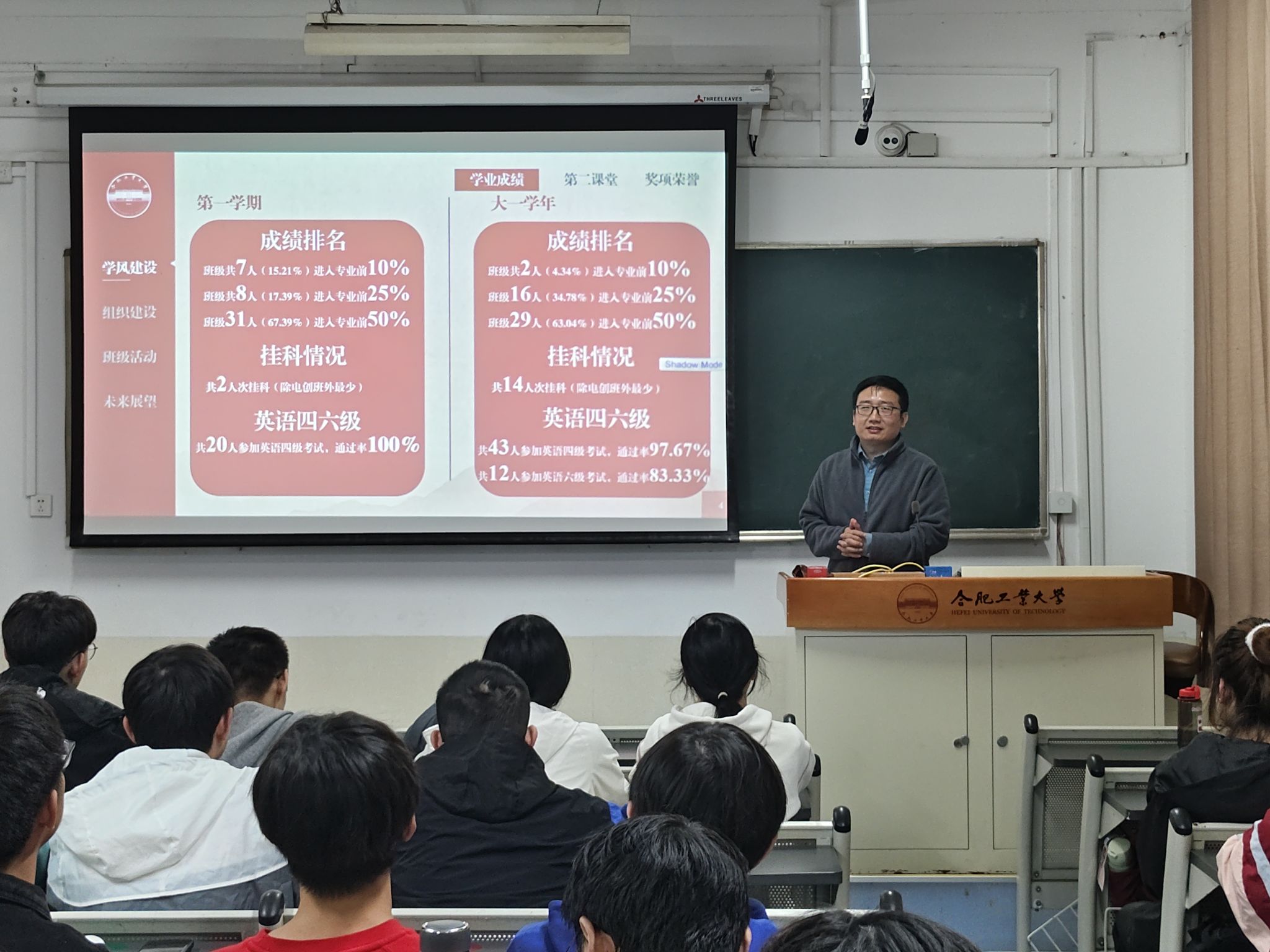 学风映照,青春启航。班会伊始,班长张熠同学结合幻灯片展示,以饱满的热情和清晰的思路从学风建设、组织建设、活动开展三个方面,详细介绍了班级的整体情况。在学习方面,班级的平均成绩稳步攀升,英语四六级的通过率年级排名靠前。在组织建设上,同学们不仅按时完成了党团布置的任务,更是积极向党组织靠拢,展现出了班级的凝聚力和向心力。在活动开展部分,通过一张张生动照片的回顾,带领大家重温了大一学年的每一个精彩瞬间,这些回忆让同学们更加珍惜现在,激发了他们积极向上的动力。