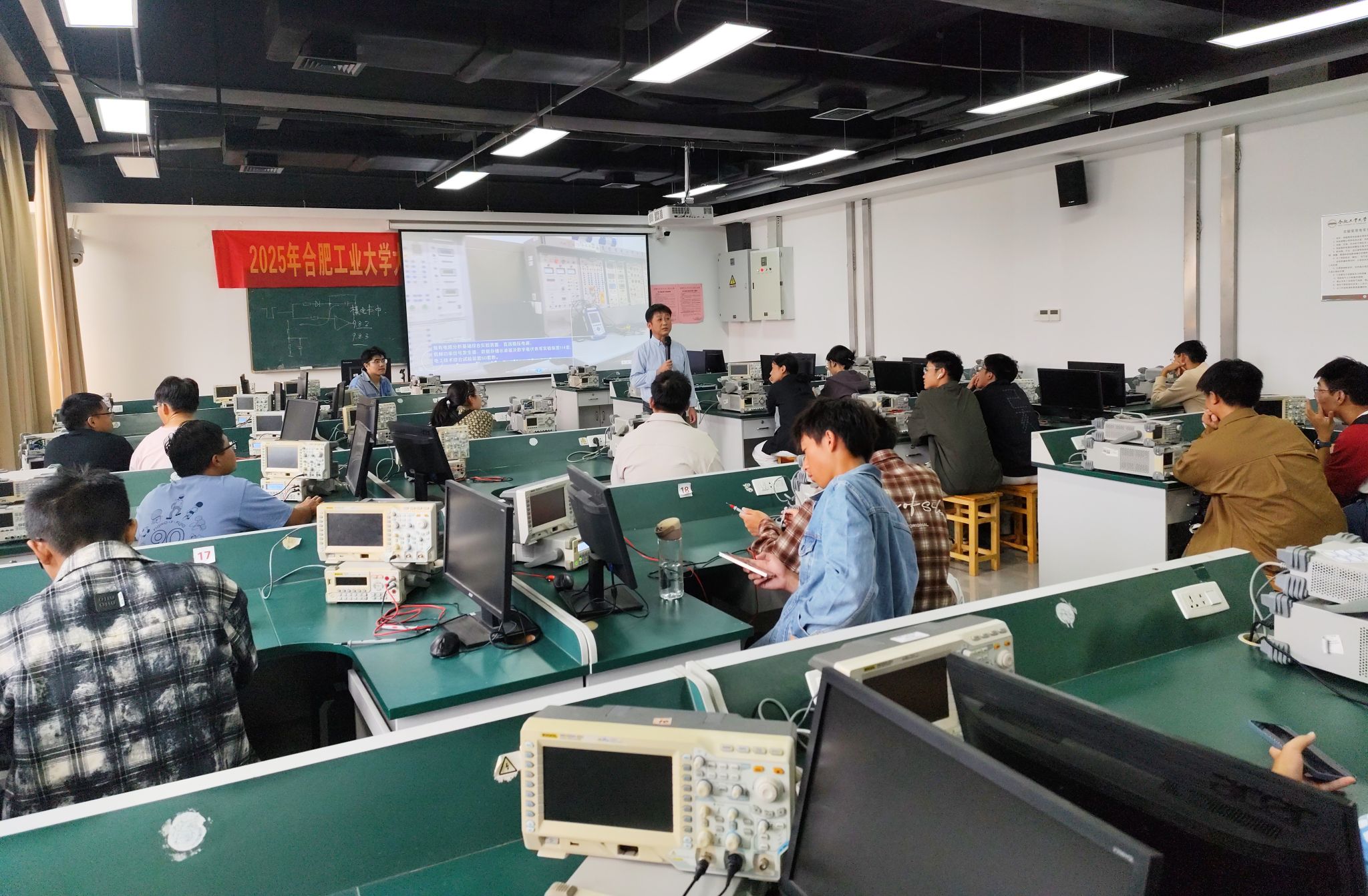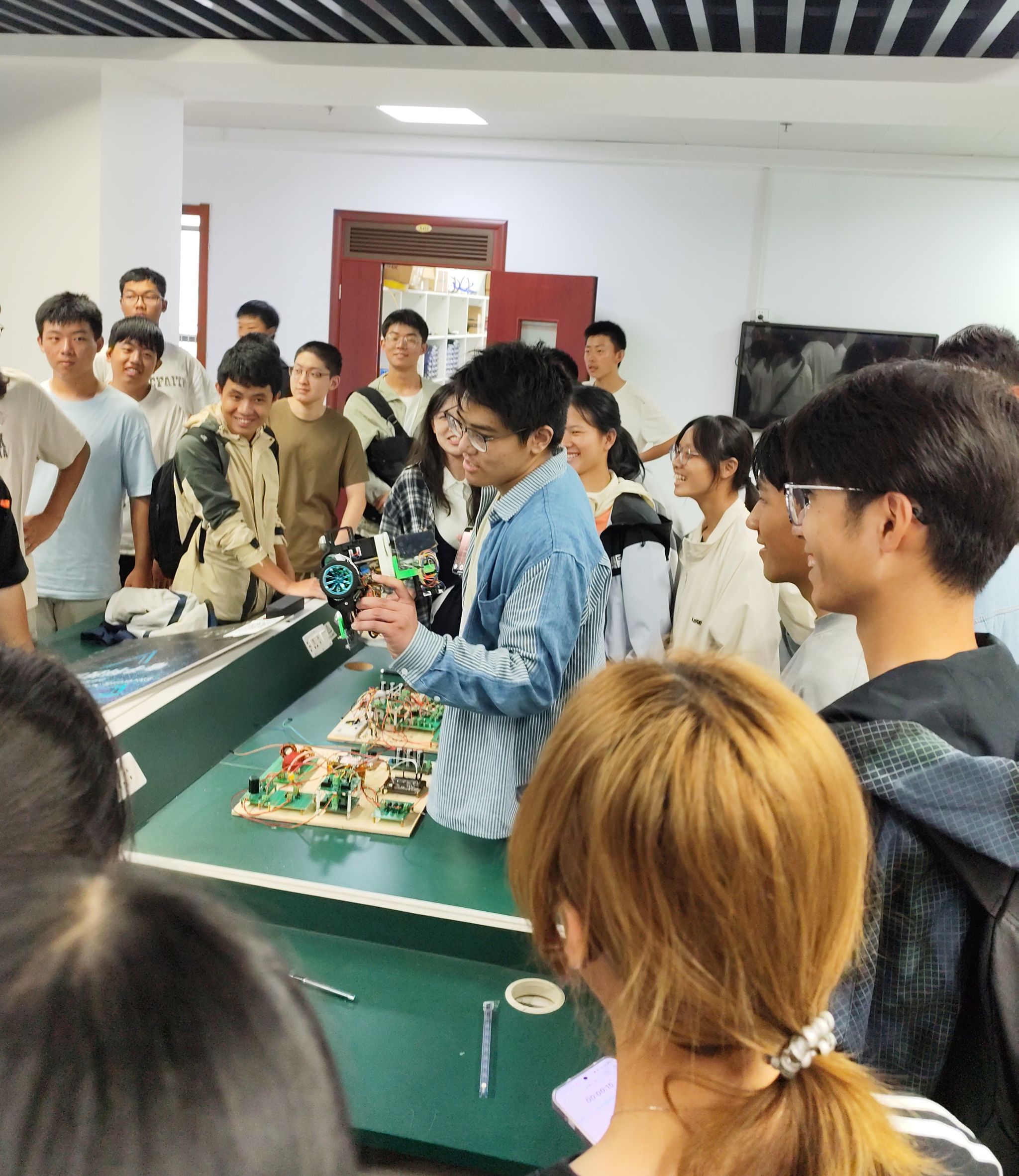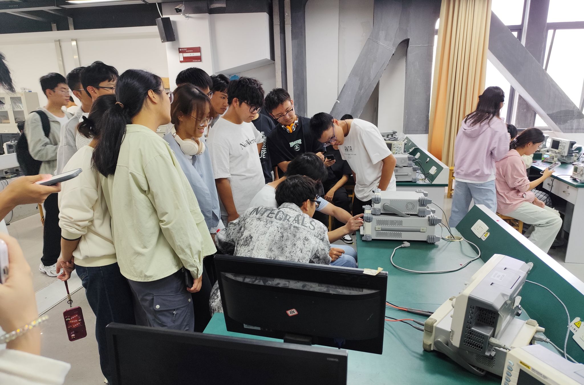 全体2025级新生共分为十二组,电工电子实验中心主任戴雷等老师分别带队参观。参观中,带队老师向同学们介绍了电工电子实验中心的基本情况和特点,讲解了各个实验室的设施设备与实验成果,带领大家走进“电”的奇妙世界。高年级学长学姐展示讲解了实验室往届各类大赛的优秀作品,激发了大家的科研兴趣。在老师的演示和指导下,同学们亲眼见证了神秘的“电”在实验设备中“现出真身”,并亲手体验了用专业设备测量“电”,体会了“电”的创造与运用。