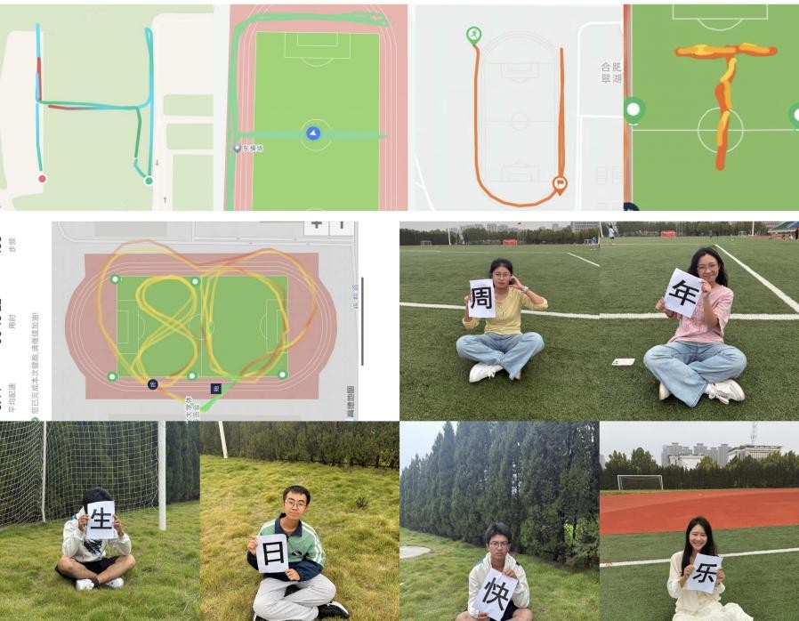 健康跑路线覆盖校园标志性场景——翡翠湖校区田径场、科教楼、图书馆等,让新生在奔跑中感受校园风貌与岁月底蕴。暮色中,学子们如跃动的星沿校园脉络奔跑,脚步作笔,跑道为笺,再观校园印记。同学们举着“生日快乐”的牌子掠过工大,轨迹里藏着励人湖的故事、校训石的箴言。当“HFUT”“工大心”等图样在运动软件上呈现,将学子们爱校热忱具象化。