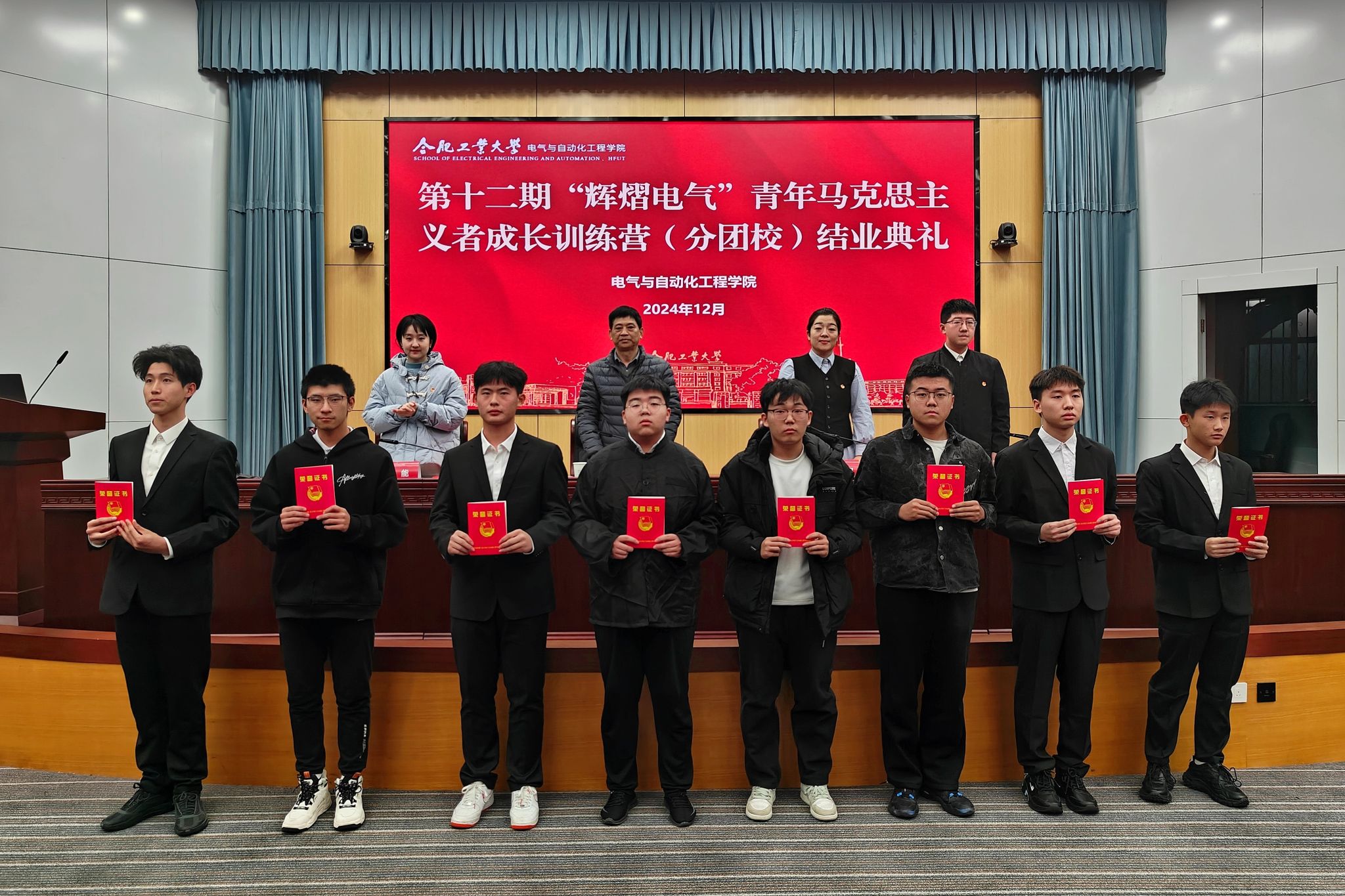 典礼在全体成员庄严肃立、引吭齐唱团歌中拉开帷幕。左能宣读了《关于同意m88官网第十二期“辉熠电气”青年马克思主义者成长训练营(分团校)学员结业的决定》,刘开阳宣读了《关于m88官网第十二期“辉熠电气”青年马克思主义者成长训练营(分团校)优秀学员表彰的决定》。本期训练营共计80名学员顺利结业,张育硕等16名同学获评“优秀学员”荣誉称号,与会领导老师为优秀学员颁奖并合影留念。2024级电气工程及其自动化专业腾赫同学作为学员代表发言,分享了团校培训中的收获与感悟,表达了在实现中华民族伟大复兴征程中书写青春华章的决心。施大顺在总结中肯定了本期分团校培训取得的效果,勉励全体学员继续加强学习,以科学理论武装自身,保持优良品格,以使命担当感召自身,树立理想信念,以坚定信仰鼓舞自身,用实际行动践行青年学子责任,勇担时代赋予青年的使命。