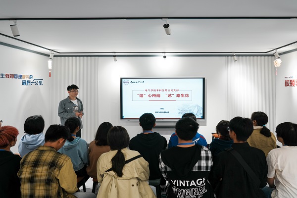 “展艺·青年”,恣意青春。在员工社区七号楼沙龙空间,校十佳文体素质标兵、青春筑梦导师苏钰雅从专业学习、科技竞赛、艺术体育、课余生活等多维度分享成功“秘籍”,独特意志、多元发展,四年的晨起迎朝阳,挑灯战黄昏,一次次伏案实验测数据,无数次跌倒再爬起,她在困境中磨炼意志,在挫折中积累经验,在挑战中成就自我,她以“非典型多面体”形容自己,并以“勤奋、自律、担当”激励电气学子奋发有为、坚毅前行。校音乐部部长张炜以“用实践传递使命,以奉献点燃青春”为题,从自身员工干部、文艺竞赛、公益志愿等实践经历出发,鼓励同学们要勇于试错,以失败为崭新开始,勤于反思,在修正中提升自我。